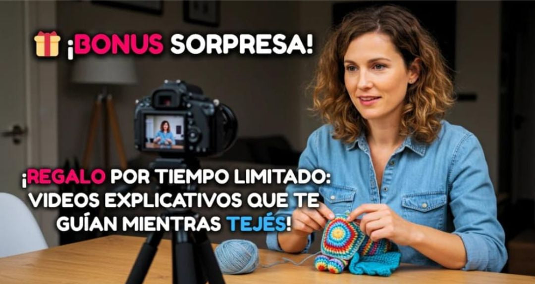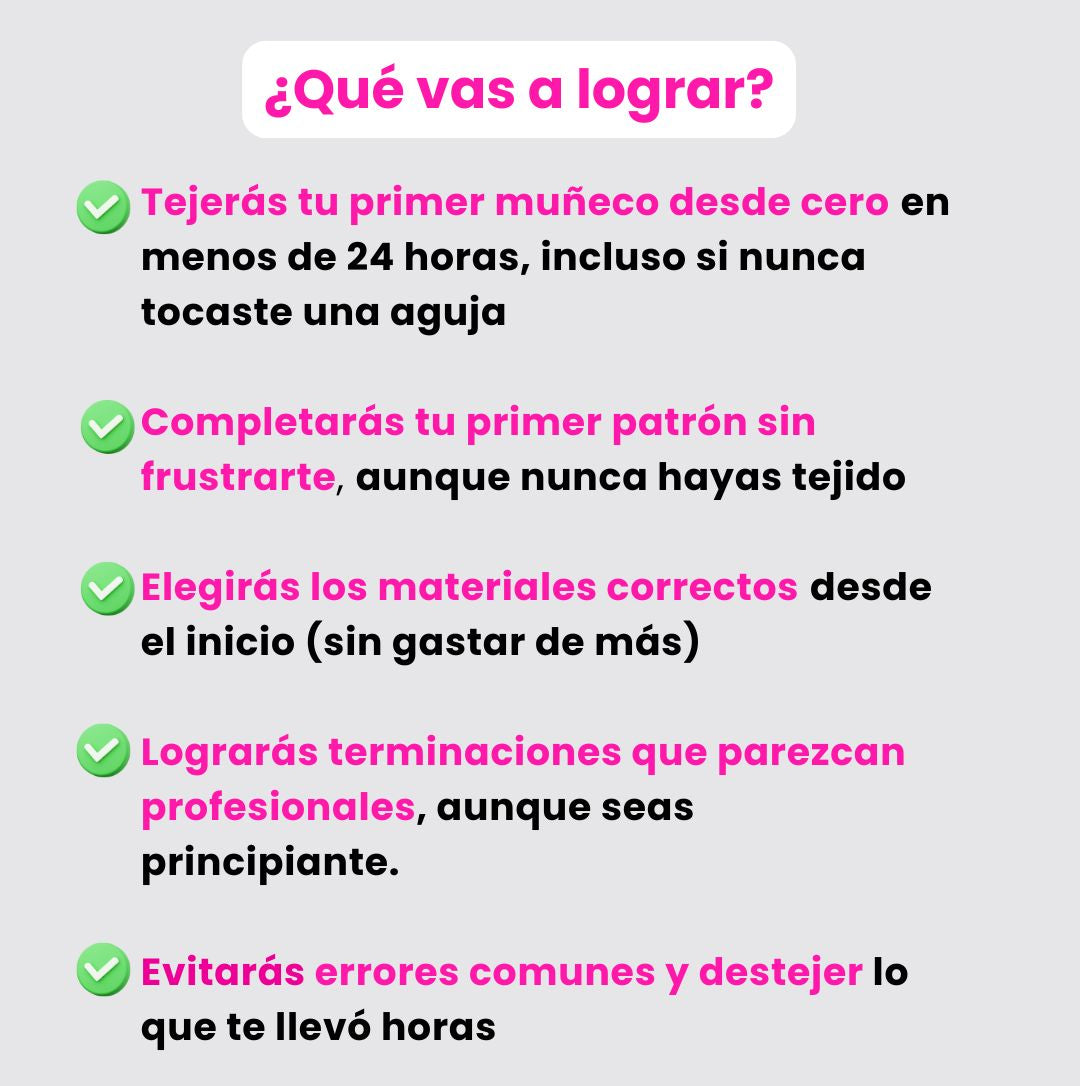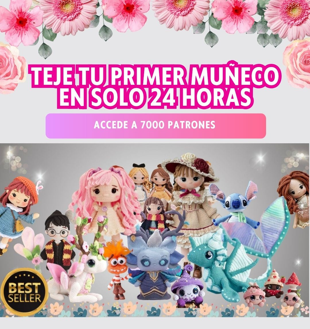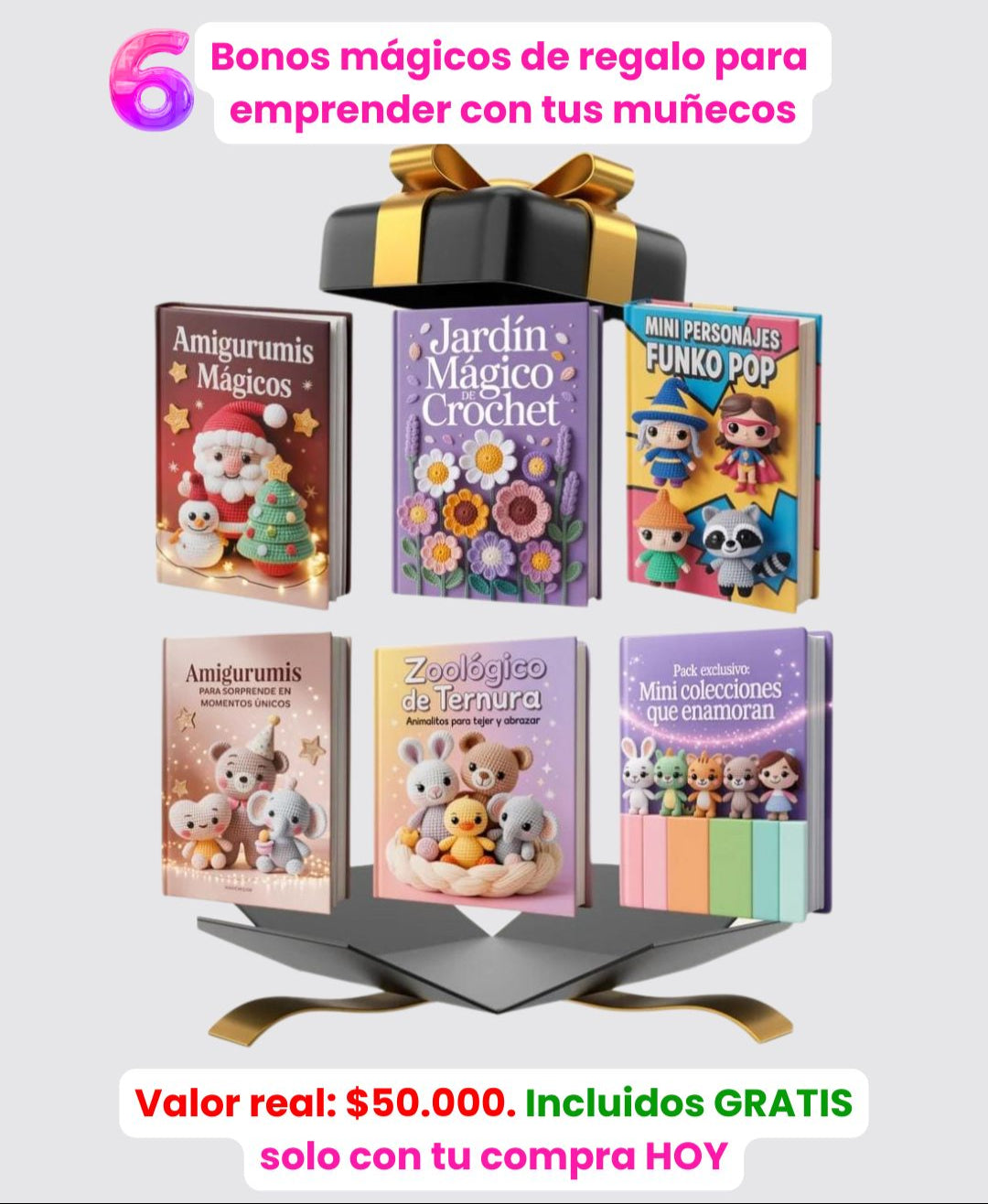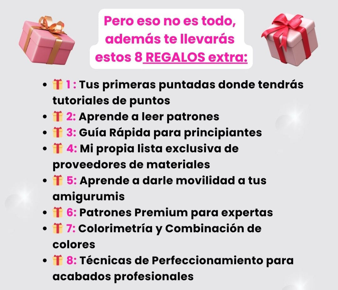 Incluye una guía completa para hacer tu primer amigurumi en 24hs, +7.000 patrones hermosos, y 14 bonos exclusivos para ayudarte a crear, organizarte y empezar a vender.